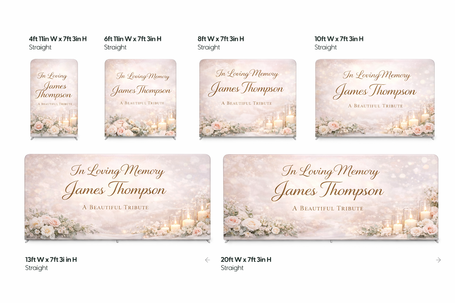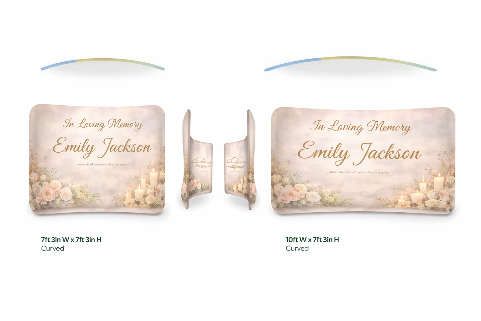 Perfect for memorials, celebrations, and special events, this backdrop features a seamless stretch fabric that fits snugly over a curved frame, giving a smooth, wrinkle-free finish that looks professional and luxurious.